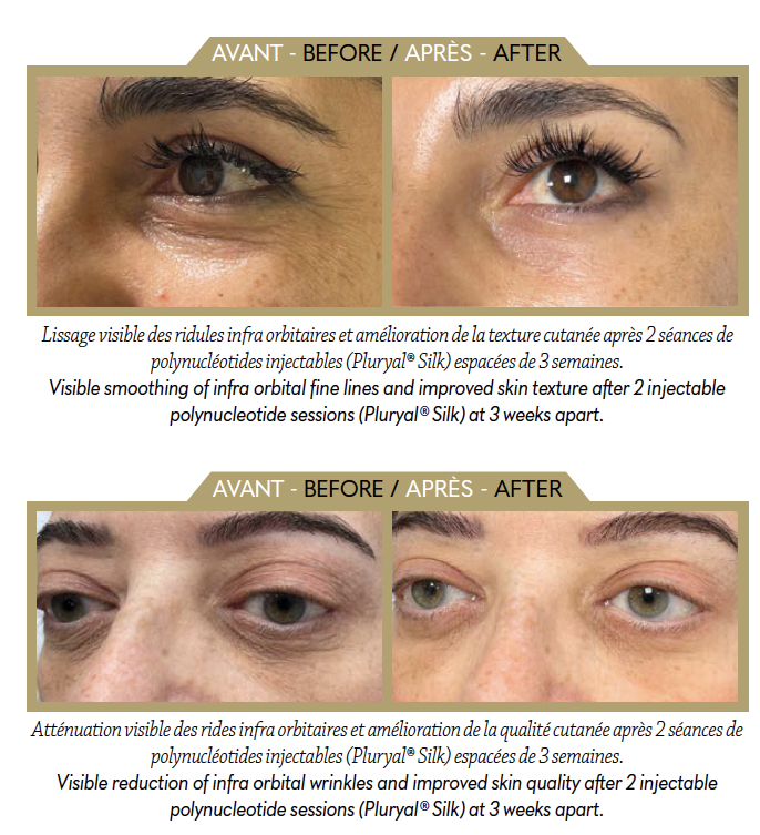 In a prospective study(1) involving 42 patients, injection of 2 mL of PN at 7.5 mg/mL, using Pluryal® Silk (MD Skin Solutions, Luxembourg), resulted in progressive improvement of lower-eyelid wrinkles and crow’s feet. FACE-Q™ scores demonstrated visible benefits from the first session, with peak efficacy at 3 months after 2 treatments. Standardised photographs confirmed smoother skin texture and a visibly refreshed eye contour.